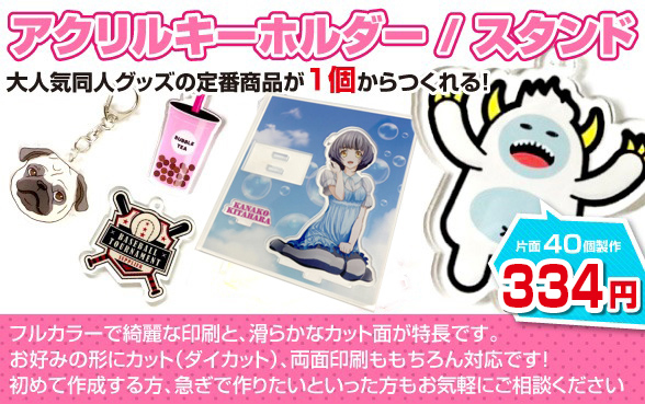 製作例![]() アクリルカラー:クリアー アクリルカラー:クリアー ナスカン![]() ボールチェーン ![]() ボールチェーン ![]() ナスカン ![]() アクリルスタンド ![]() アクリルスタンド (マグネット入り加工) データ作成料